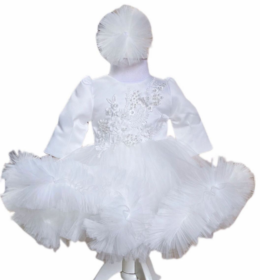 Această rochiță de botez este realizată din materiale fine și delicate, perfecte pentru pielea sensibilă a bebelușului.