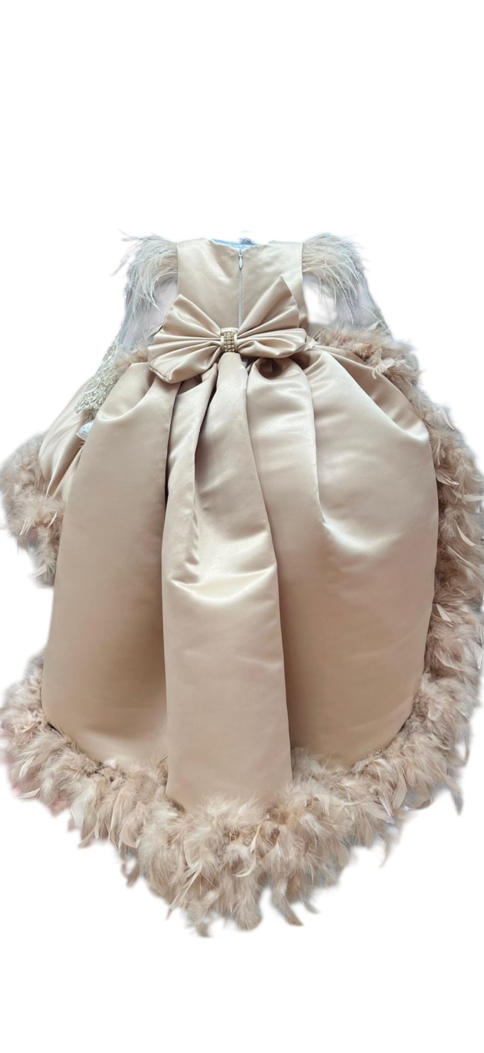 O rochie spectaculoasă, creată pentru a transforma fiecare fetiță într-o adevărată apariție de poveste! Realizată din tafta alba de calitate superioară, cu finisaje strălucitoare și volum amplu, această piesă unicat este împodobită cu flori 3D, cristale delicate și pene elegante care adaugă un aer teatral și rafinat. Talia este accentuată cu o broderie prețioasă, iar designul în straturi oferă un efect de prințesă desăvârșit.