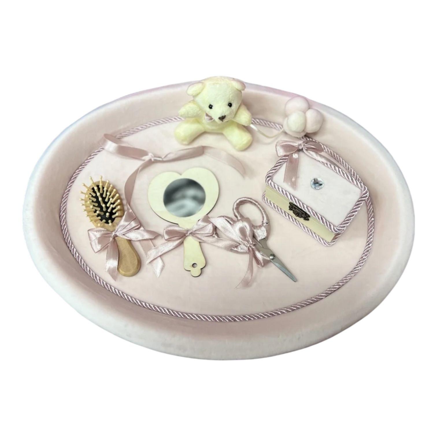 Realizată cu grijă și atenție la detalii, această tăviță este îmbrăcată în catifea fină, oferind un aspect elegant și luxos momentului special al copilului tău. Poate fi personalizată cu numele micuțului, data evenimentului și nuanțele preferate.