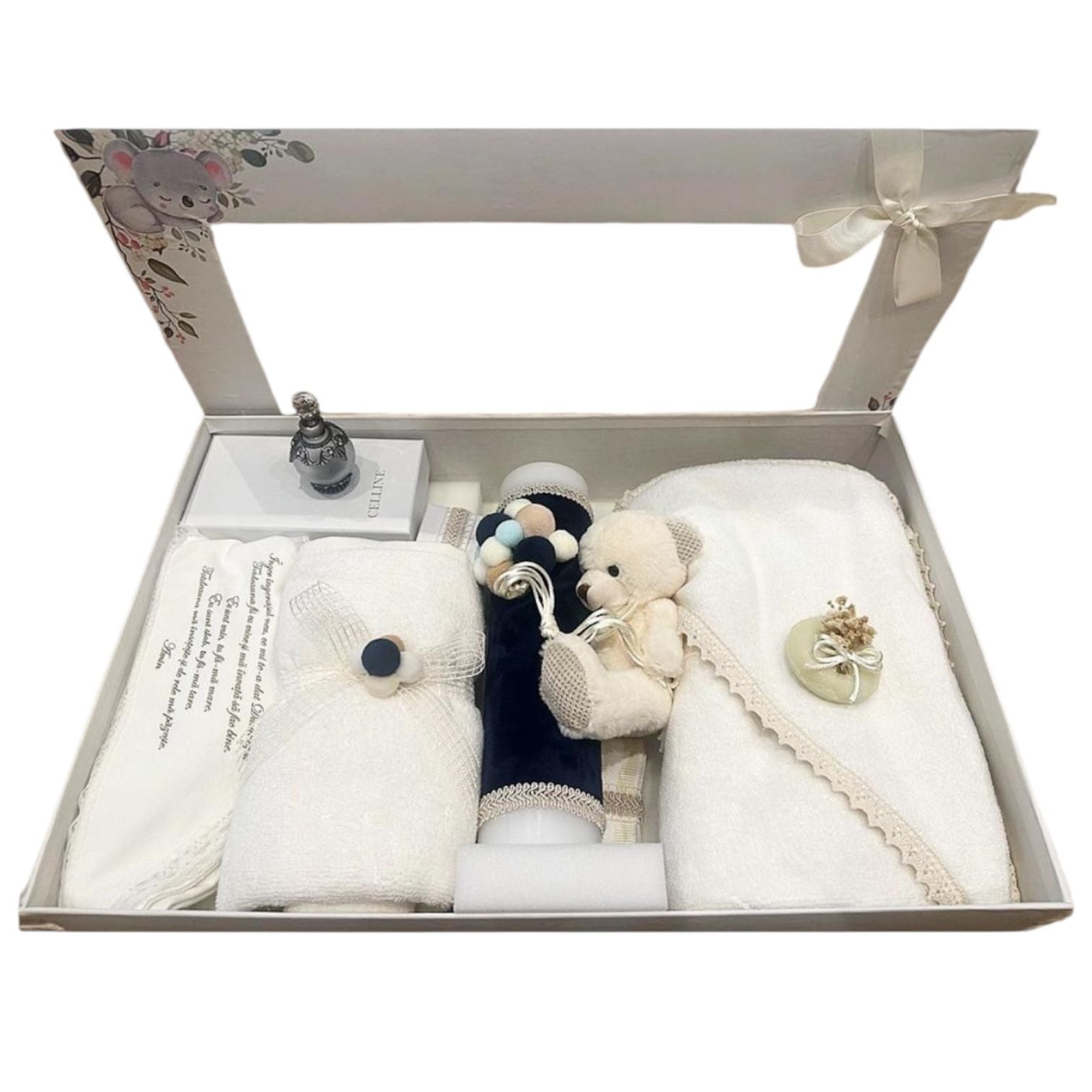 Trusoul este format din cutiuță pentru moț, sticluță mir, prosop bebe cu capison ,prosop preot, pânză cu capison ,fașă și săpun.
