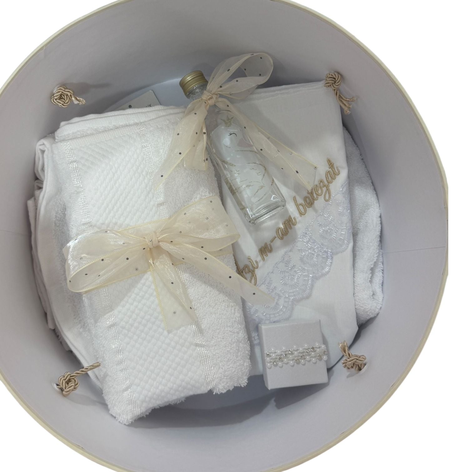 Acest trusou de botez este realizat cu grijă și atenție la detalii, special pentru a marca primul moment important din viața micuțului tău. Setul conține toate elementele esențiale pentru ceremonia religioasă, îmbinând tradiția cu eleganța și rafinamentul.